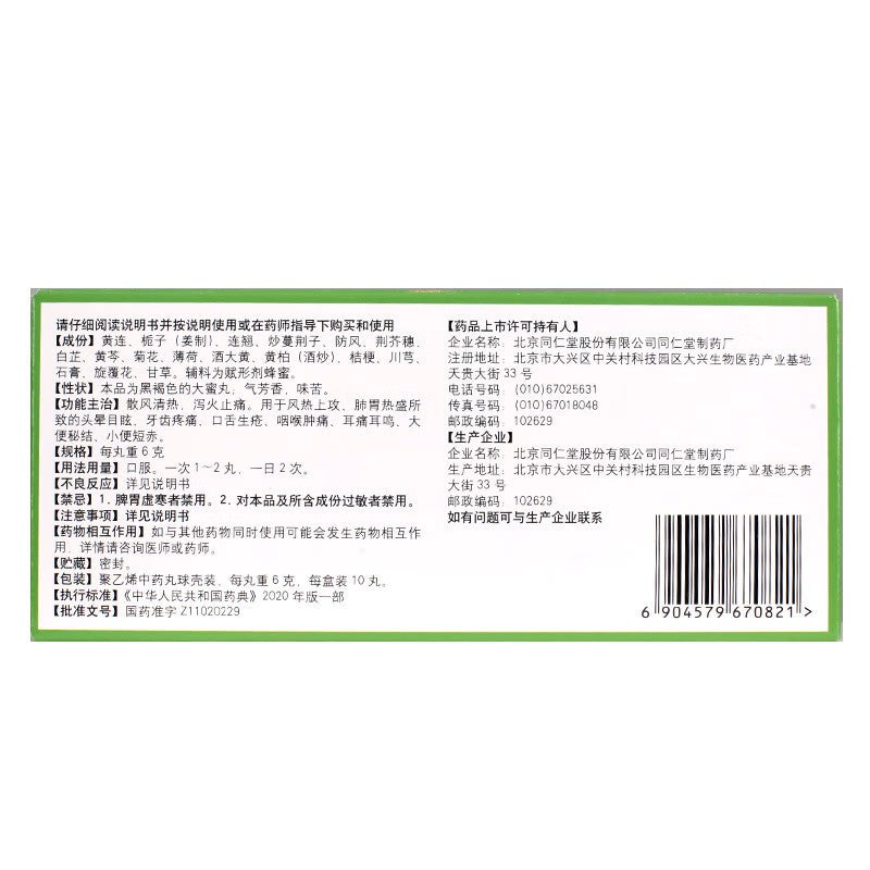 Artificial Calculus Bovis, Mentha, Chrysanthemum, Schizonepeta Spike, Angelica Dahurica, Ligusticum Wallichii, Gardenia, Coptis, Phellodendron, Scutellaria, Rhubarb, Forsythia, Red Peony Root, Angelica Sinensis, Rehmannia, Platycodon, Licorice, Gypsum, Borneol. Excipient: Honey (as a binding agent).